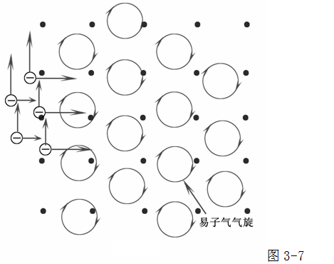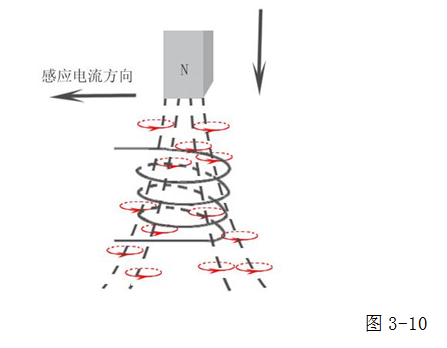 如图3-10,从上向下沿磁力线方向看,磁场产生大量易子气气旋,气旋沿逆时针方向旋转,当磁铁自上向下靠近线圈时,气旋的内侧不断与线圈发生碰撞,带动导线中的自由电子沿导线按顺时针方向运动,形成逆时针的感应电流。