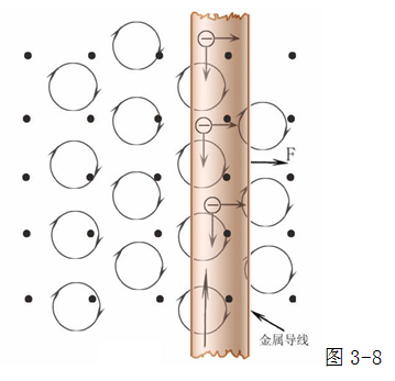 如图3-8,磁力线指向纸外, 通电导线电流方向向上,那么电子流方向向下,易子气气旋为顺时针旋转,导线中向下运动的电子碰到气旋将受到向右的作用力,使导线受到向右的作用力。
