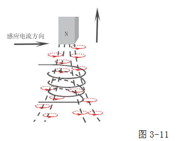 如图3-11,当磁铁自下向上远离线圈时易子气气旋的外侧不断与线圈发生碰撞,带动导线线中的自由电子沿导线按逆时针方线中的自由电子沿导线按逆时针方向运动,形成顺时针的感应电流。
